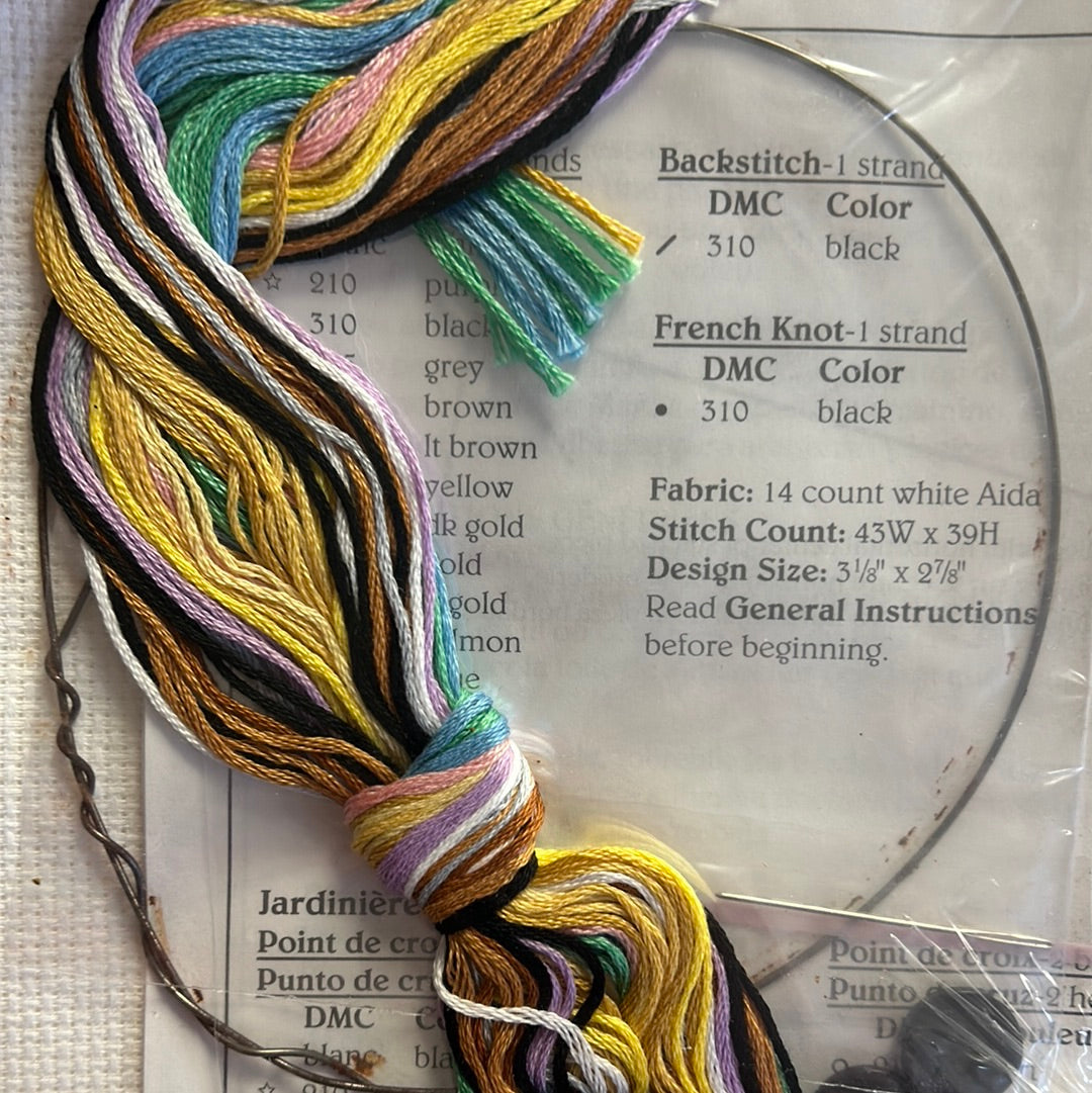 Kit included 14 count aida, cotton floss, bag, wire, buttons, needle, chart and instrustions
