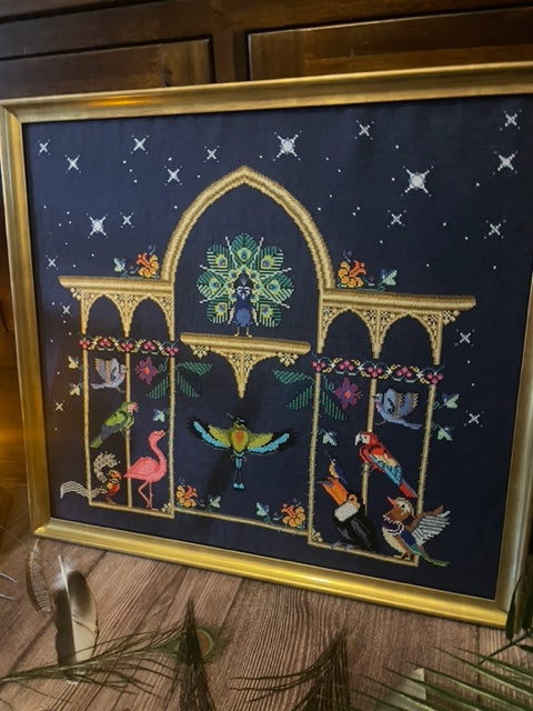Model stitched on 32 ct Navy linen by Zweigart