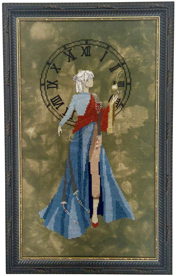Model stitched on 32 count Wet Lands linen by Atomic Ranch Fabrics
